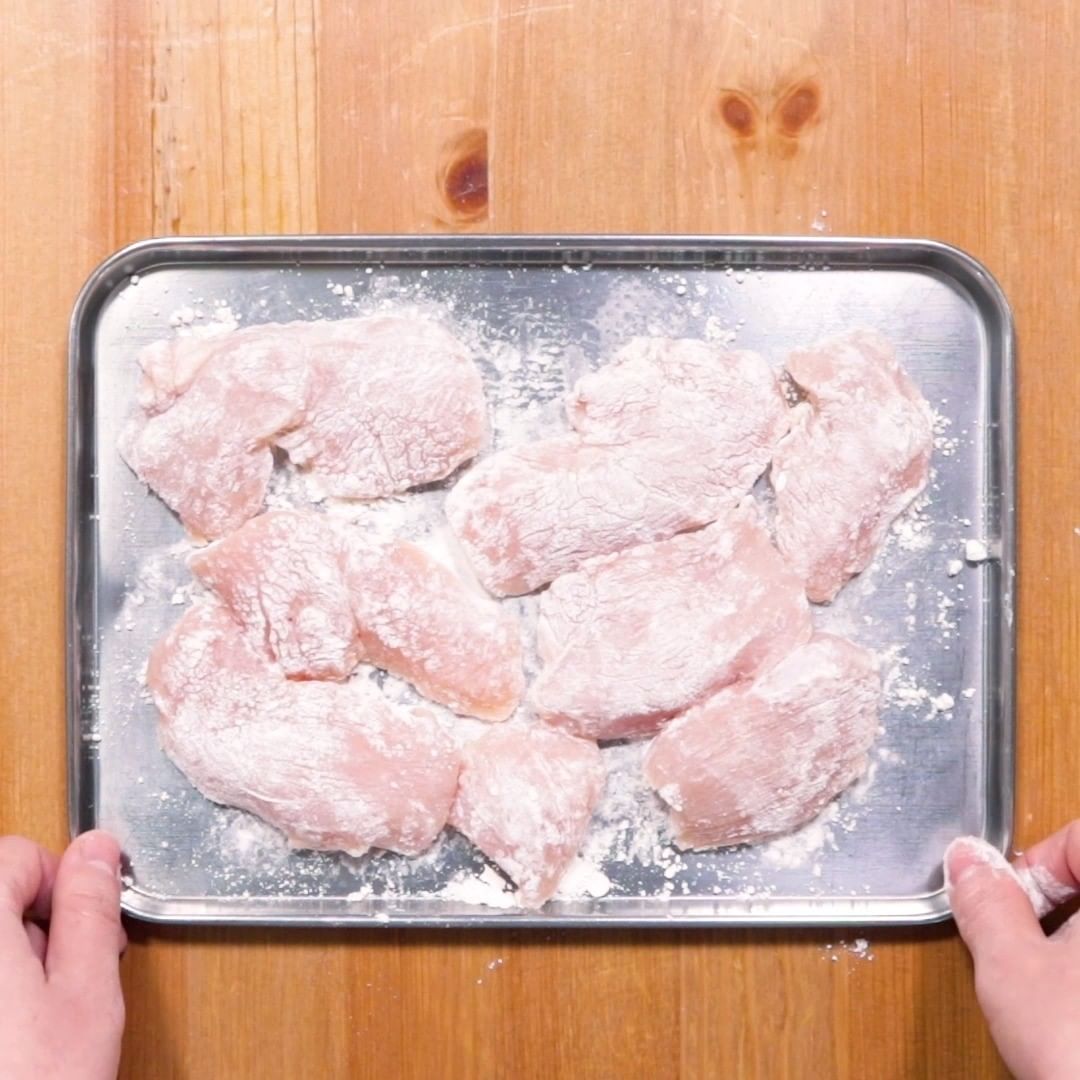 2. 鶏むね肉は1cm幅のそぎ切りにし、下味の材料を揉み込み5分ほど置き、軽く水気を切って薄力粉を薄くまぶします。