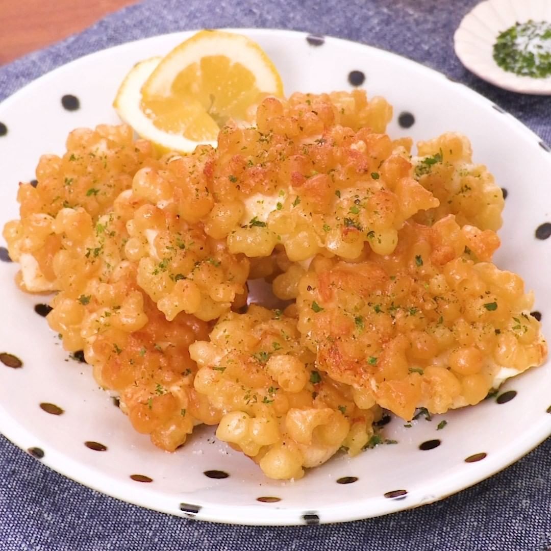 揚げ玉を衣代わりにすることでサクサク感が長持ちします♪揚げ玉のおかげで少ない油で揚げ物風に仕上がり、後片付けも簡単です!青のりの香りがさらに食欲をそそります♪ボリューム満点なので、今晩のおかずにいかがでしょうか?