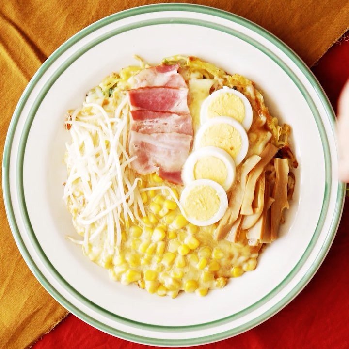 4. ひっくり返し、混ぜ合わせた《A》、チーズ60gを順にのせ、コーン、もやし、ゆで卵、メンマ、ベーコンをバランスよくのせ、さらに蓋をして4分加熱する。