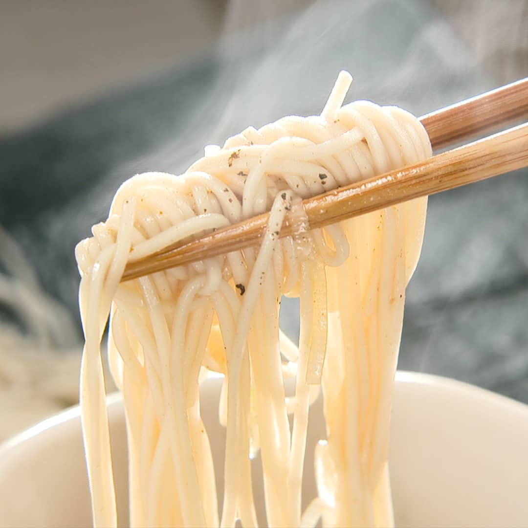 ①乾麺を袋に記載通りの時間で茹でる