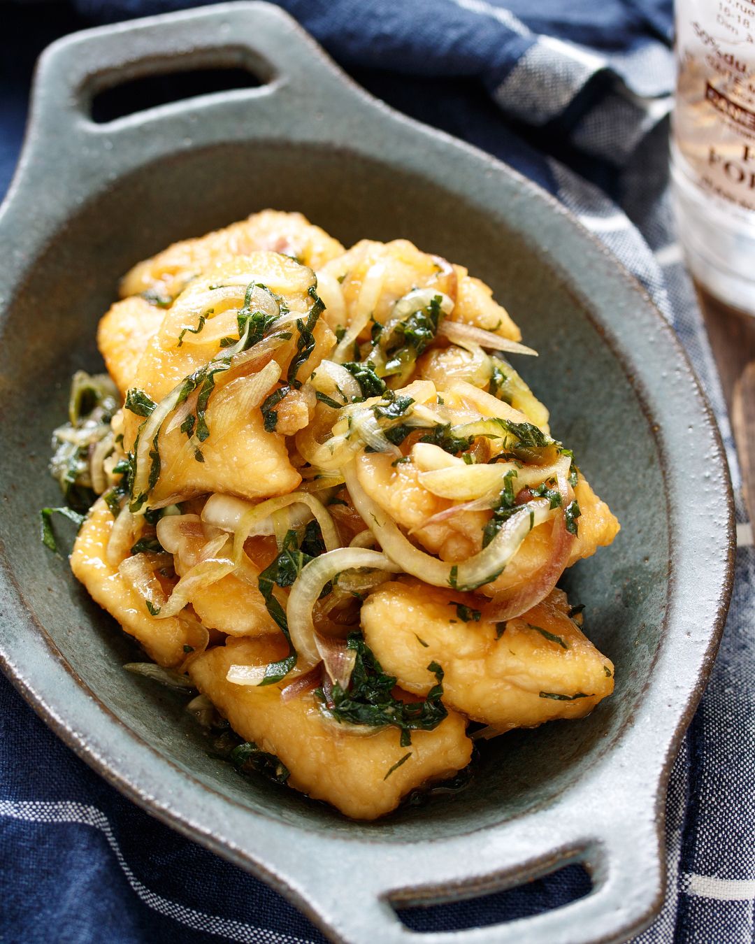 ③フライパンにごま油を広げ、片栗粉をまぶした①を並べる。中火にかけ4分焼いたら裏返し、蓋をして3分蒸し焼きにする。全体に火が通ったら②に漬け込み、粗熱が取れるまでおく。