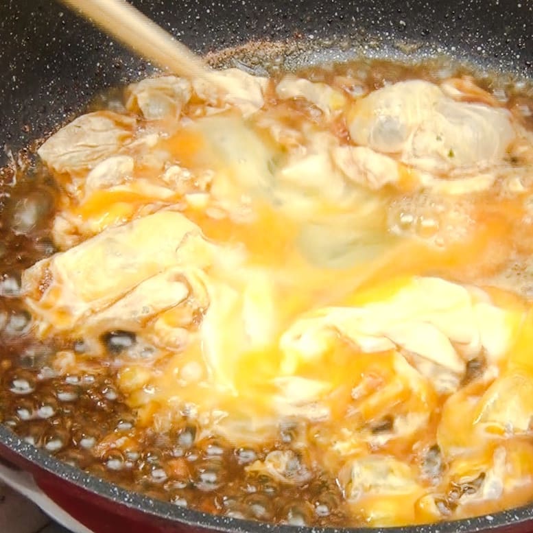 ⑨1分軽く混ぜながら煮詰めたら卵とじの完成
