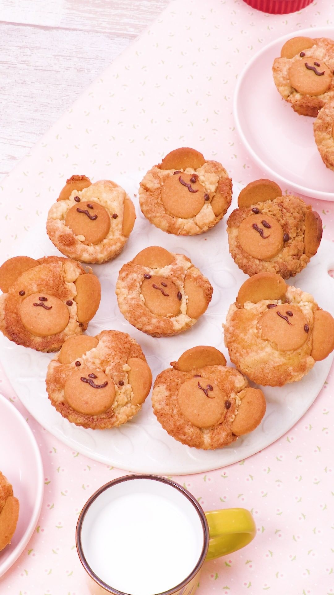 (5)バナナを加えてさっと混ぜ、マフィンカップに等分に入れる。クランブル生地を等分にちらし、クッキーをのせて耳と鼻を作る。天板にのせて170℃に予熱したオーブンで10分焼き、アルミホイルをかぶせてさらに15分焼く。(串などを刺してドロっとした生地がついてくる場合は様子を見て5分ほど追加加熱しましょう。)