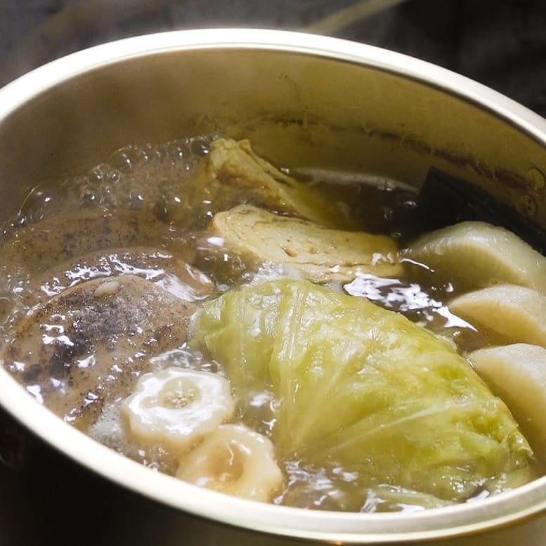 ⑤ちくわぶ1本を5等分して鍋に入れ、40分ほど煮込んで完成!