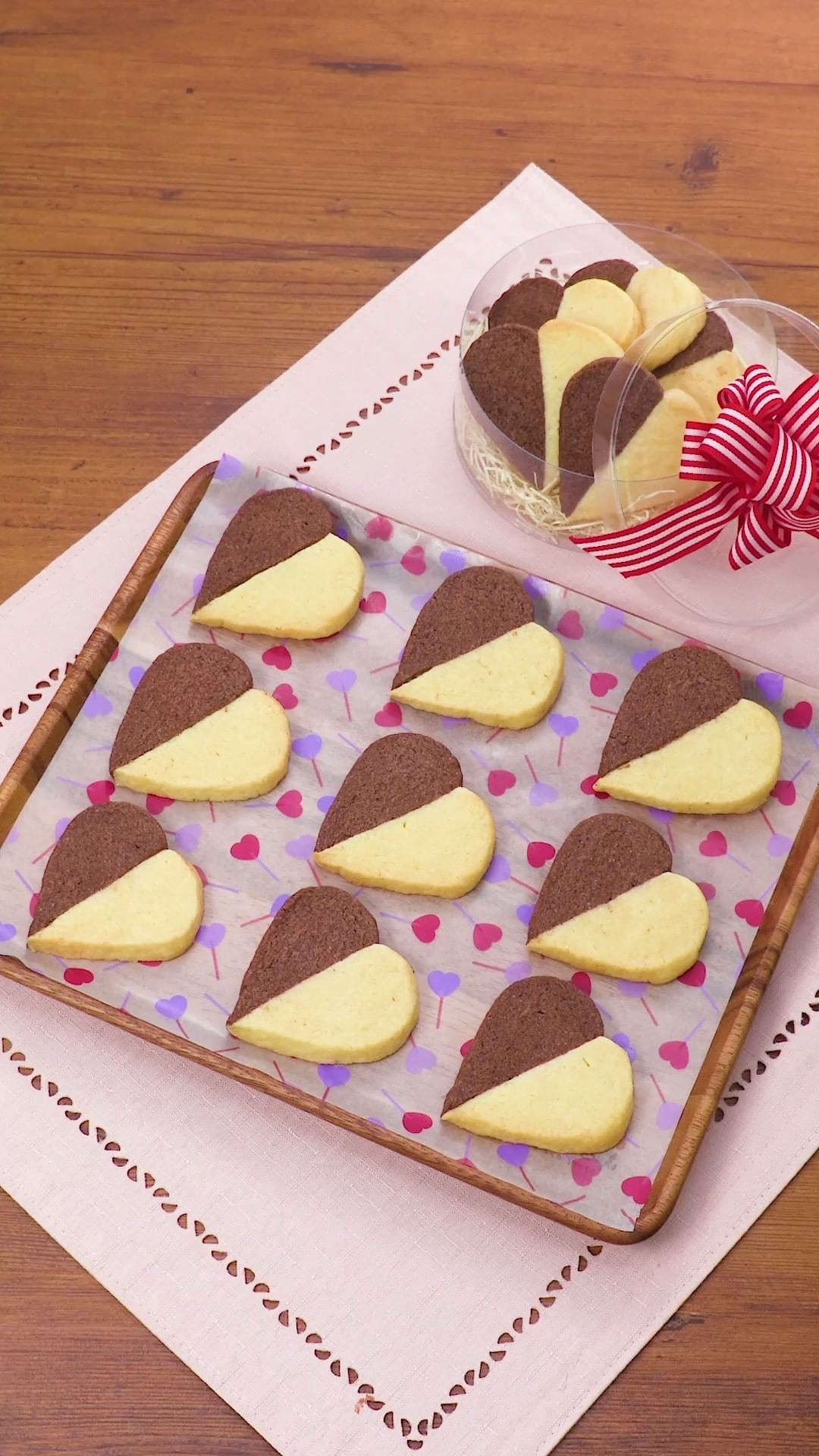 斜めに切って組み合わせれば2色がかわいいハートクッキーの出来上がり♪型がなくてもできるので手軽に作れておすすめです。生地はしっかり冷凍庫で冷やしてから焼成すると垂れにくく、きれいな形に仕上がります。