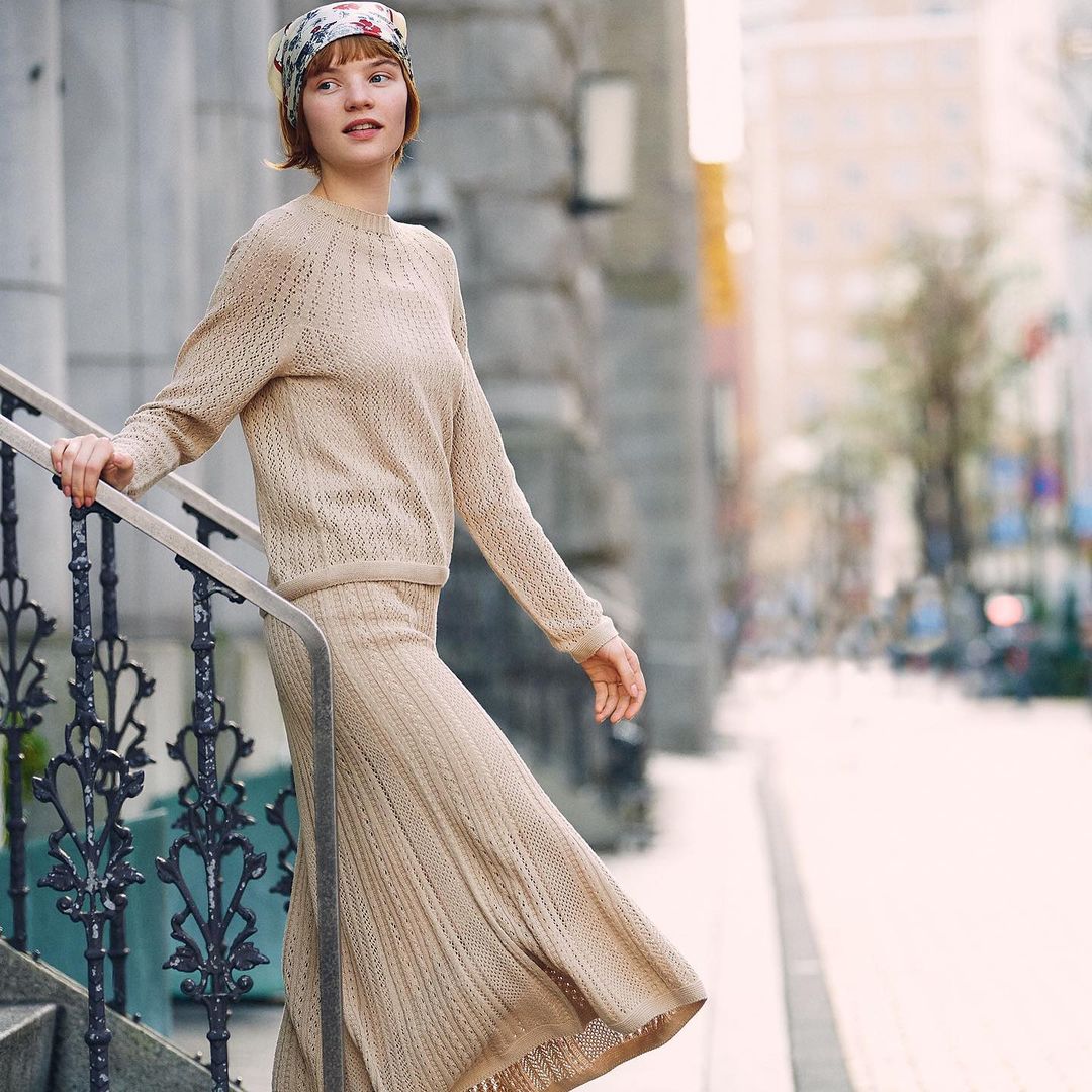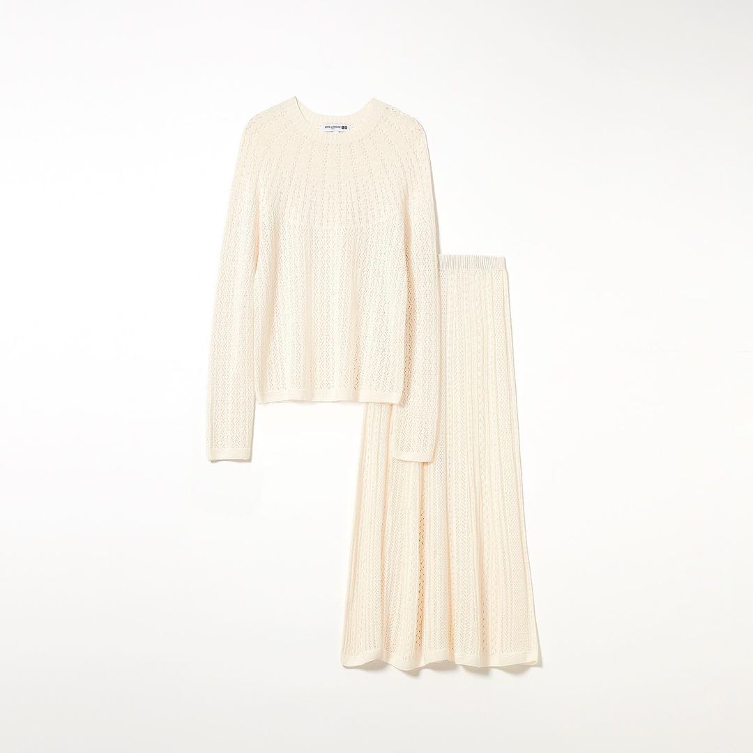 Delicate and detailed pointelle whole garment sweater makes you elegant.