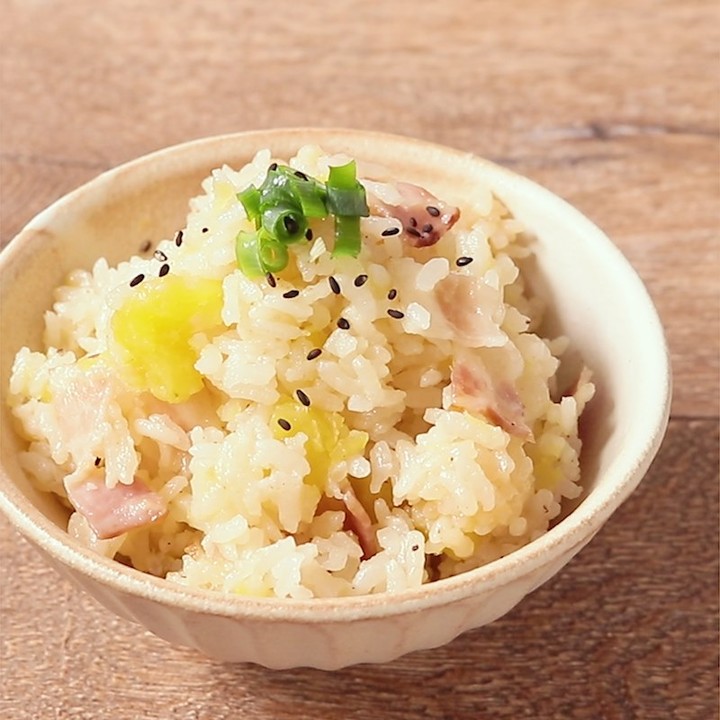 炊飯器で簡単に作れる、さつまいもとベーコンの炊き込みごはんはいかがでしょうか。ほっこりと優しい味のさつまいもと、旨味たっぷりのベーコンが美味しい炊き込みごはんは、おにぎりにしても美味しいですよ。是非作ってみてくださいね。