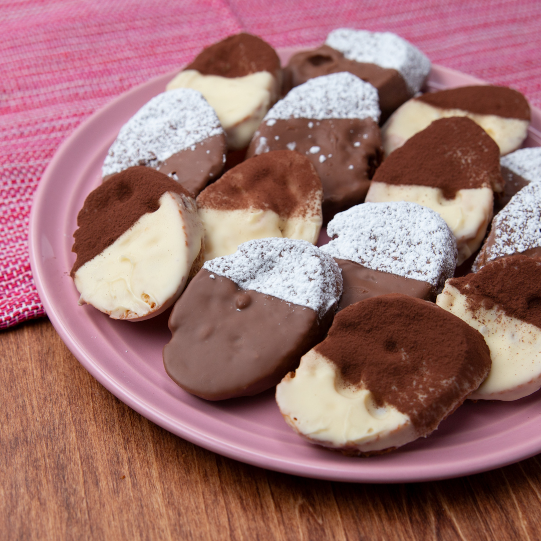 6.カットしたクッキングシートを使い、ミルクチョコレートのバケットには粉糖を、ホワイトチョコレートのバケットにはココアパウダーを斜め半分にふるって模様をつけたら、完成!⁣