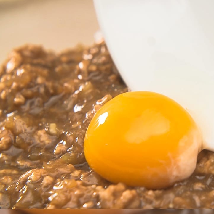 ⑥ご飯に盛り付け卵黄をのせたら完成!