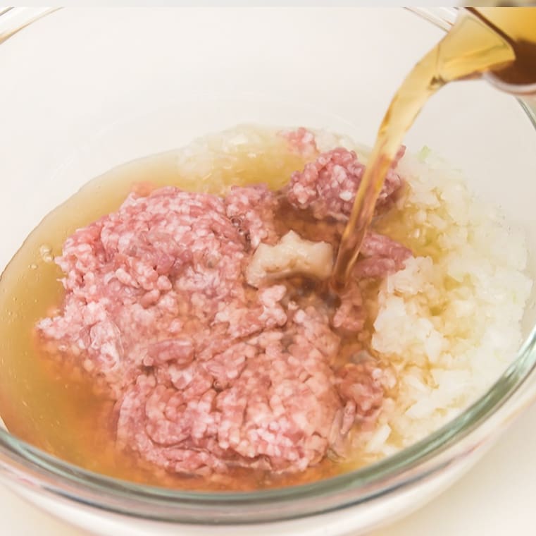 ③豚ひき肉150g、おろしニンニク小さじ1/2、ほうじ茶200ccを加えて混ぜる
