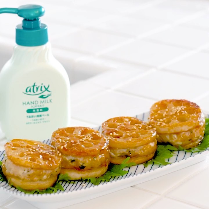 大葉が香る豆腐つくね入りのレンコンのはさみ焼きのレシピです。ふっくら食感の豆腐つくねに、すりおろしたレンコンを加えてもちもち感をプラスします。大葉の風味が香るもちふわの豆腐つくねが、シャキシャキのレンコンと相性抜群!ぜひ作ってみてください。また手洗いの後の乾燥が気になる方には、ぬれた手のまま使える「アトリックス ハンドミルク」がおすすめ。ポンと手に出して、スルッっとのばして、サッと流すだけで、うるおいベールが水で広がってベタつかずしっとりした仕上がりになりますよ。ぜひお試しくださいね。