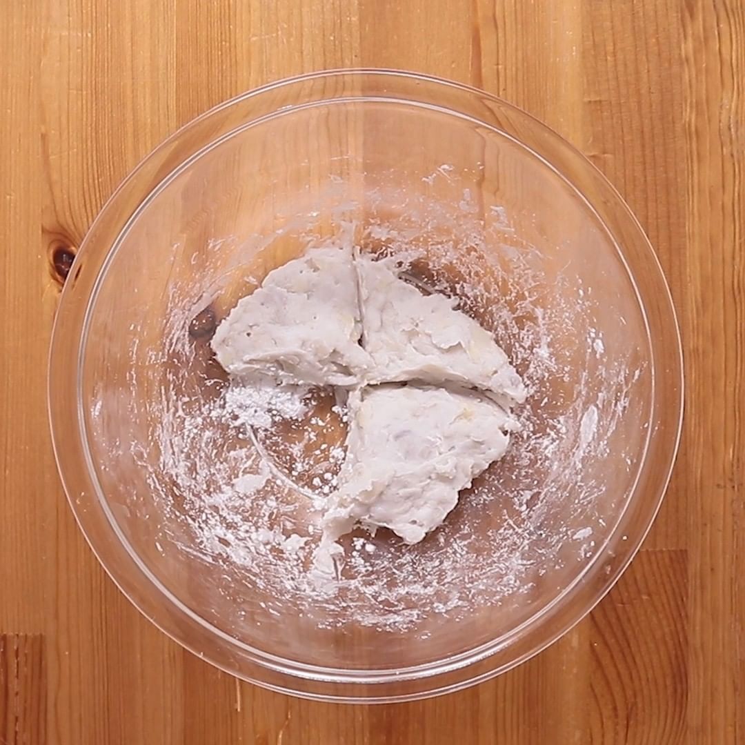 3. ①を入れ、ゴムベラでよく混ぜ合わせ4等分にし、1を包み丸く成形します。