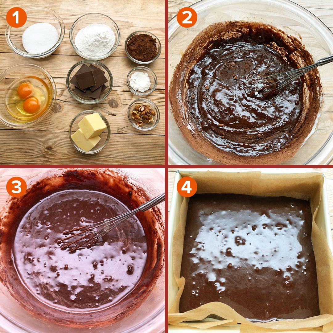 2. Put melted chocolate, melted butter, and granulated sugar in a bowl and mix, then add rice flour, cocoa powder, baking powder, and eggs, walnut and mix well with a whisk each time.⁣