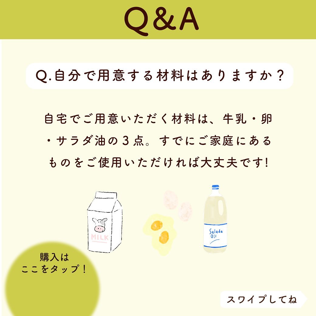 自宅でご用意いただく材料は、牛乳・卵・サラダ油の3点。すでにご家庭にあるものをご使用いただければ大丈夫です!