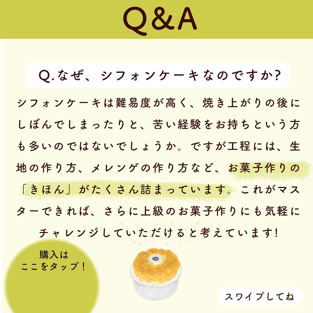 シフォンケーキは難易度が高く、焼き上がりの後にしぼんでしまったりと、苦い経験をお持ちという方も多いのではないでしょうか。ですが工程には、生地の作り方、メレンゲの作り方など、お菓子作りの「きほん」がたくさん詰まっています。これがマスターできれば、さらに上級のお菓子作りにも気軽にチャレンジしていただけると考えています!