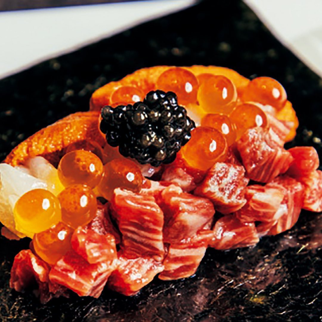 ①「うにといくらと黒毛和牛の巻き寿司」は、キャビアや帆立などを肉とともに巻いて、