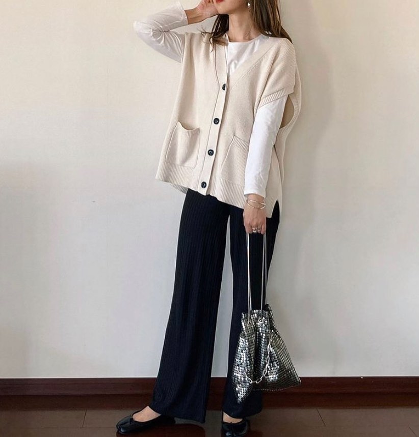 手持ちのロンTに、合わせるだけでOK👌今旬なニットベストに、挑戦してみたいですね🙌