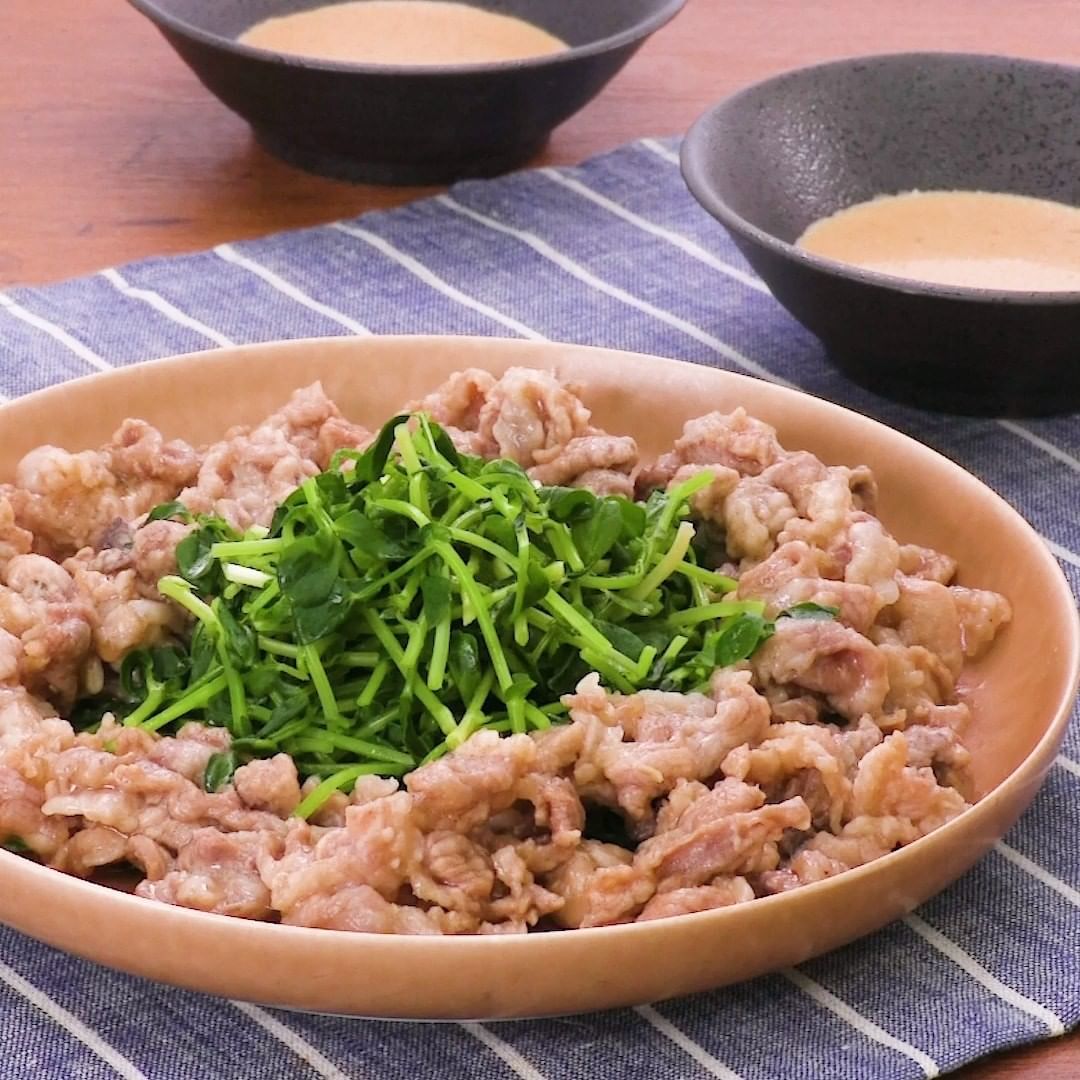 サクッとスピード夕ご飯!オールレンジ仕上げで手間いらず♪豚こまと豆苗でお財布にも優しい一品です!ごはんとの相性もバッチリ!マヨネーズが入った濃厚な味わいの簡単手作りごまだれをつけてお召し上がりください♪