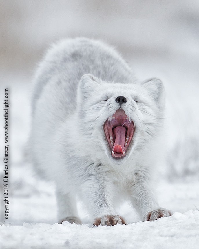 “As the fox approached I quickly pulled my gear off the tripod, hoping it would be undisturbed by my presence laying flat on my belly in snow. To my delight the fox stopped, sat down, yawned, and looked right at me for quite a while before moving on. The ground level perspective is key to this image’s success.”