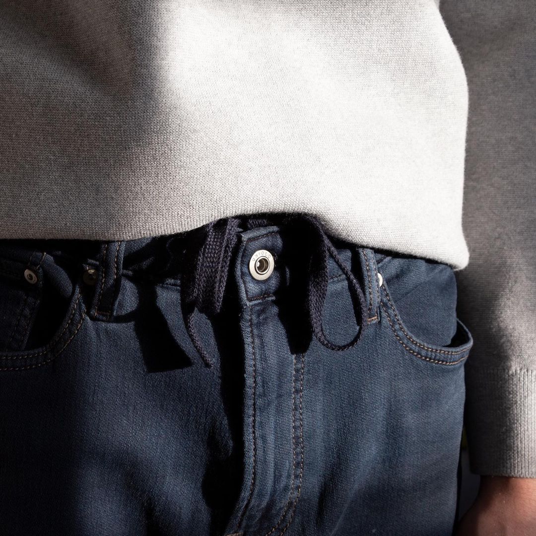 Designed with a stretch waist and removable drawstring, these jeans are perfect for going out in the world, or relaxing at home.
