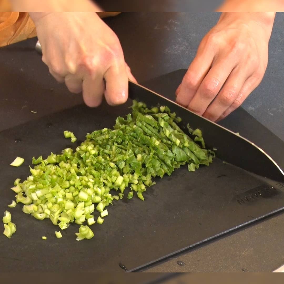 ①ショウガ大さじ1の分量とカブの葉7個分をみじん切りする