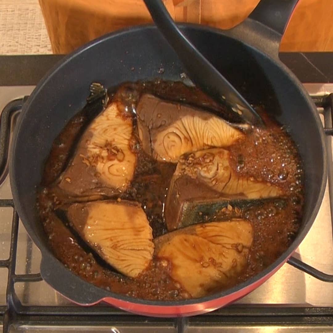 ②フライパンにしょう油・酒・みりん(各大さじ3)砂糖大さじ1、ショウガとブリの切り身300gを入れ中火にかける