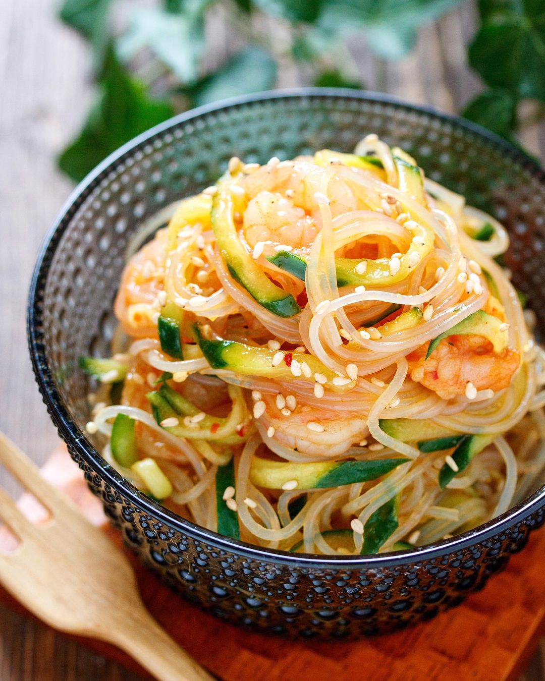①緑豆春雨は袋の表示より1分短めに茹で、ザルにあげて水気をしっかり切る。ボウルに入れ、熱いうちに焼肉のたれを絡ませる。