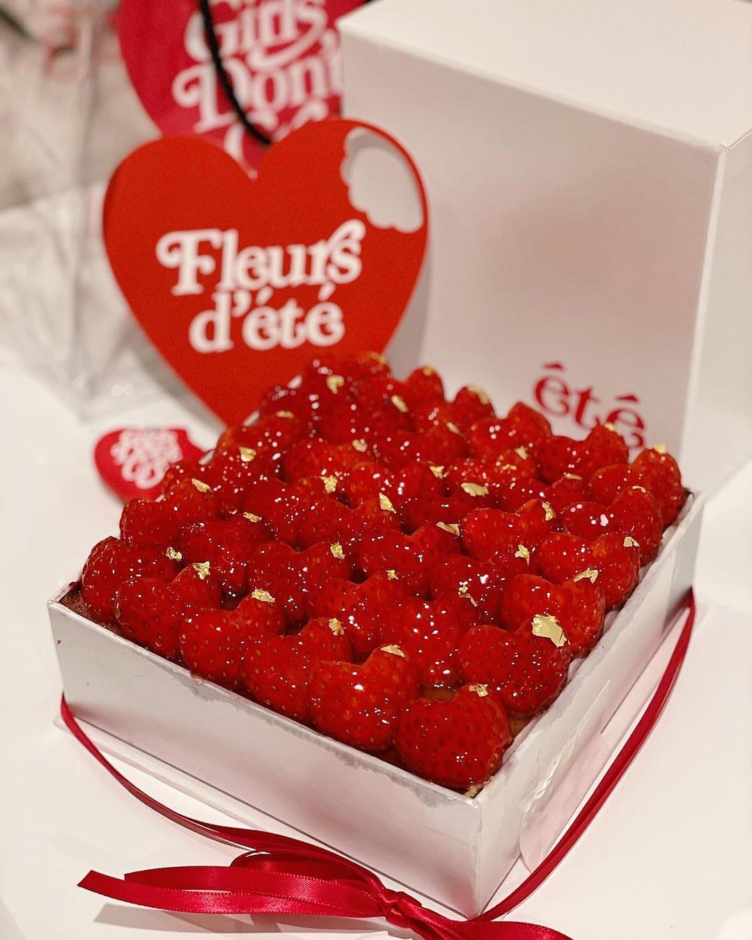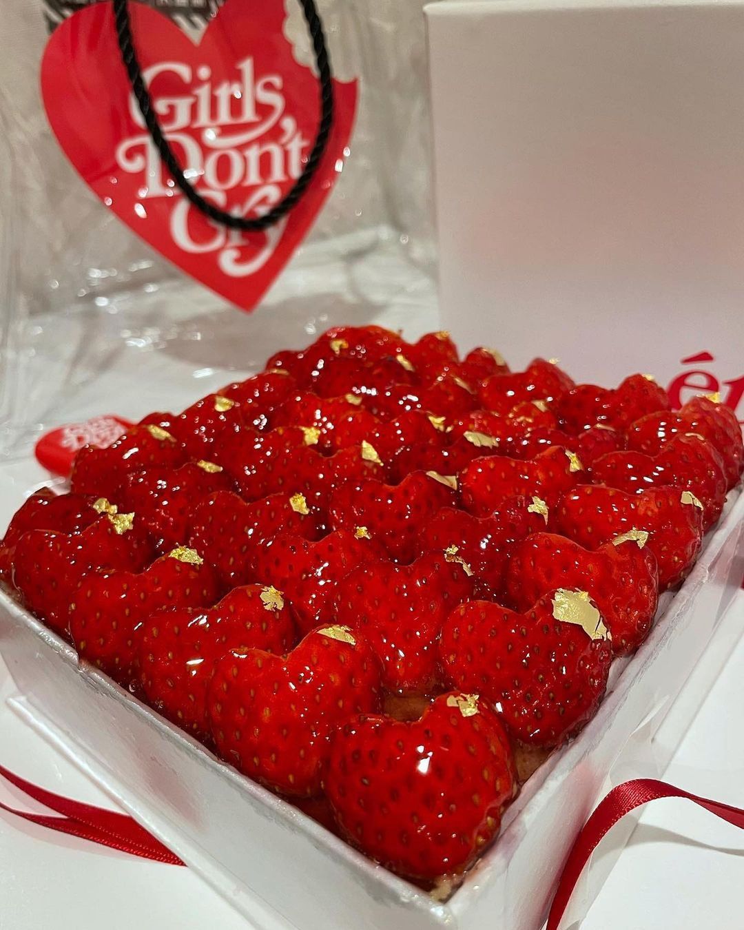 人気モダンアーティストVERDYとのコラボ作品、期間限定の「ストロベリーケーキ」👑「Girls Donʼt Cry」のアイコニックなハートのグラフィックをモチーフとしたハート型の苺は宝石箱の様にケーキの上に並べていました🥺 まさに、食べれるアート💓 通常フルーツの下にはクリームベースのケーキが敷いてあるのですが、今回はバレンタインということで、特別感のあるチョコレートベース🍫