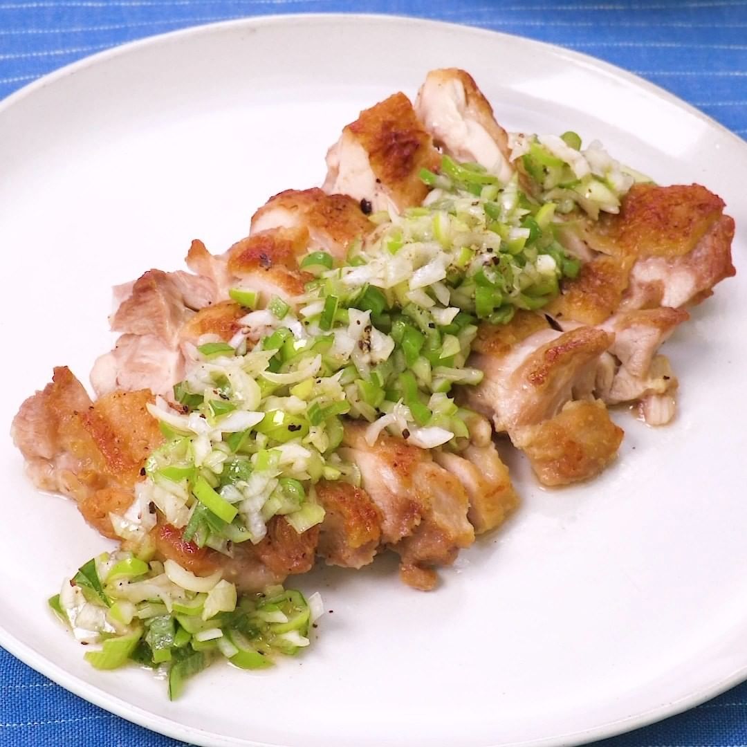 皮目をパリパリにこんがり焼いてジューシーに仕上げます!あっさりした味わいのねぎ塩だれをたっぷりとかけて召し上がれ♪鶏肉は焼き縮みを防ぐために厚みがある箇所に切り込みを入れましょう。