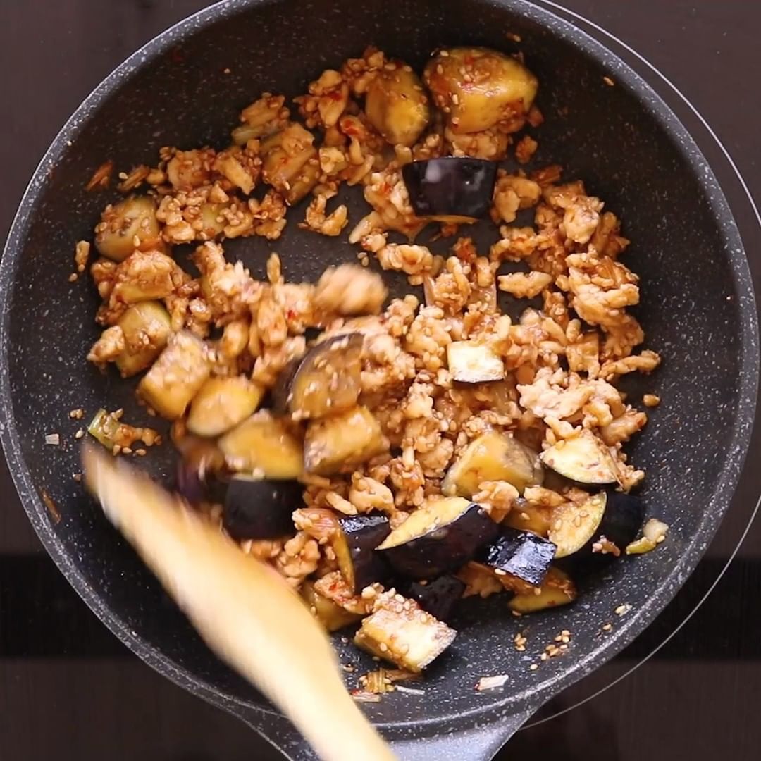 4. 3に火が通ったら、中火で鶏ひき肉を加えて炒め、火が通ったらナスを加えます。