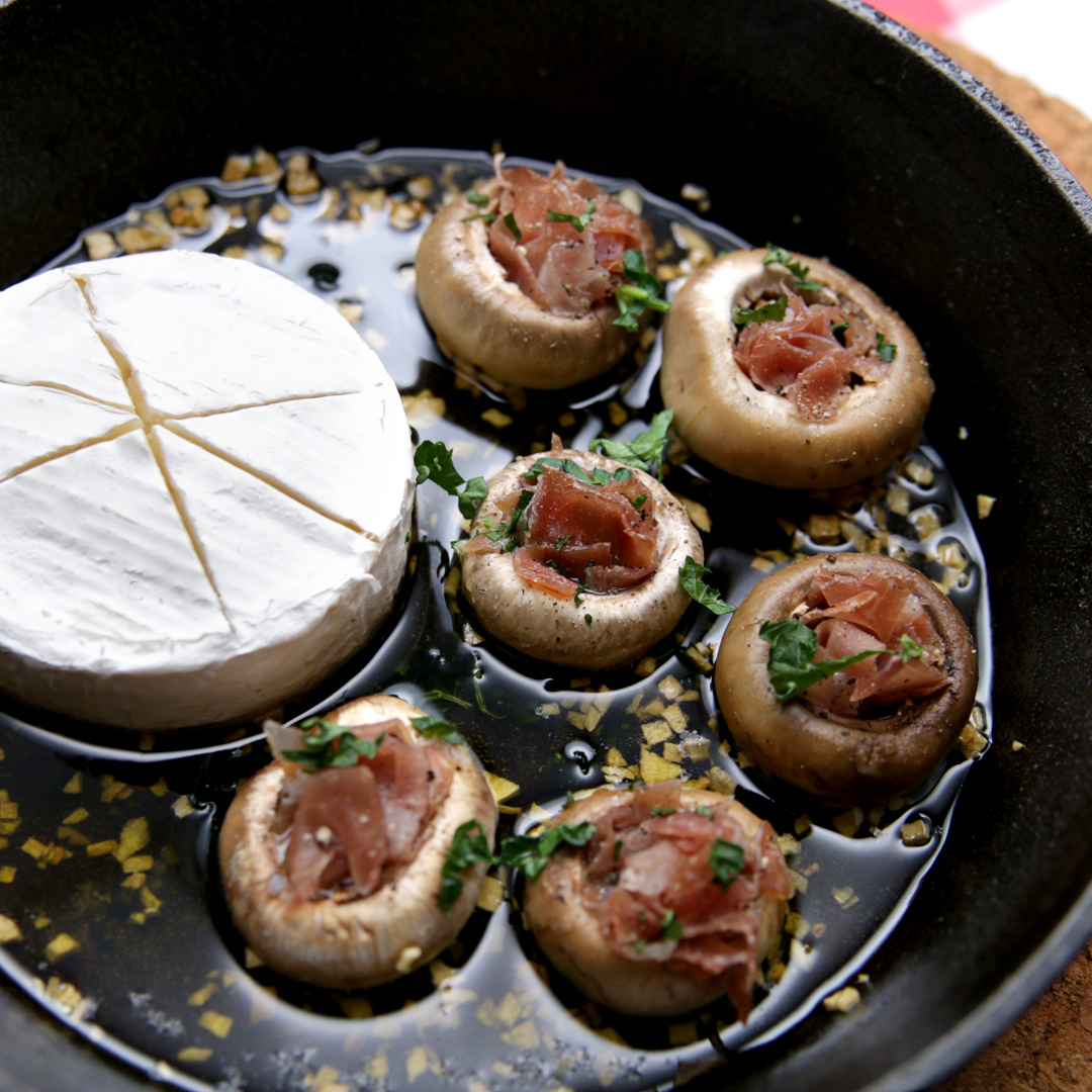 1.マッシュルームは軸をくりぬいて、生ハムを詰め、粗挽きコショウをふりかける。