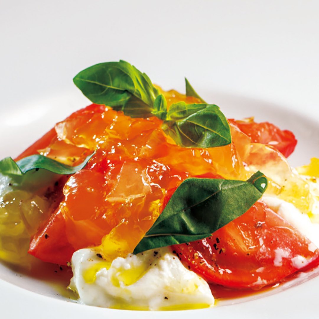 写真▷「フルーツトマトとモッツァレラチーズのカプレーゼ トマトのジュレがけ」。トマトのコンソメジュレがトマトとチーズを上手に繋ぐ