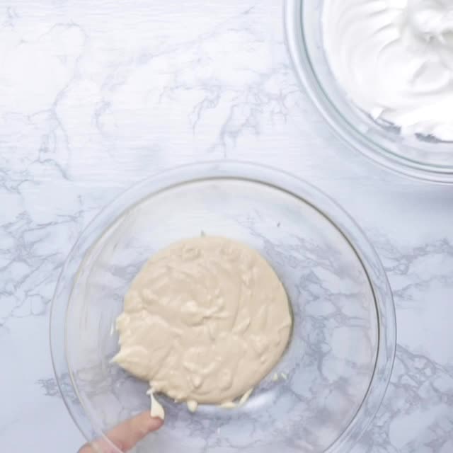 9. 残りのメレンゲを半量ずつ加え、ゴムベラでやさしく混ぜ合わせたら、(2) に流し入れる。深めの容器に入れて、型の半量程度の高さまで熱湯(分量外)を注ぎ入れる。