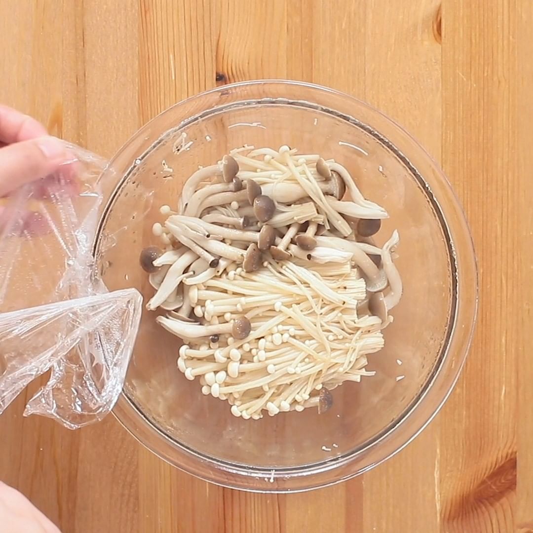 1. しめじ、えのき、茶えのきは石づきを取り除き、手でほぐします。