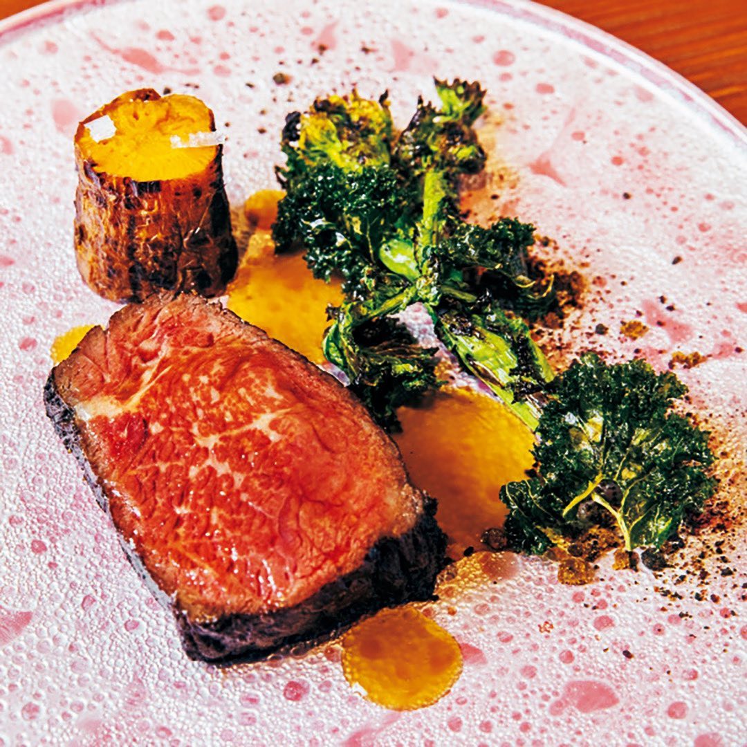 写真②▷「厳選肉の薪焼き」。佐藤さんが使う牛肉は、全て信頼する目利きの肉職人が厳選したもの