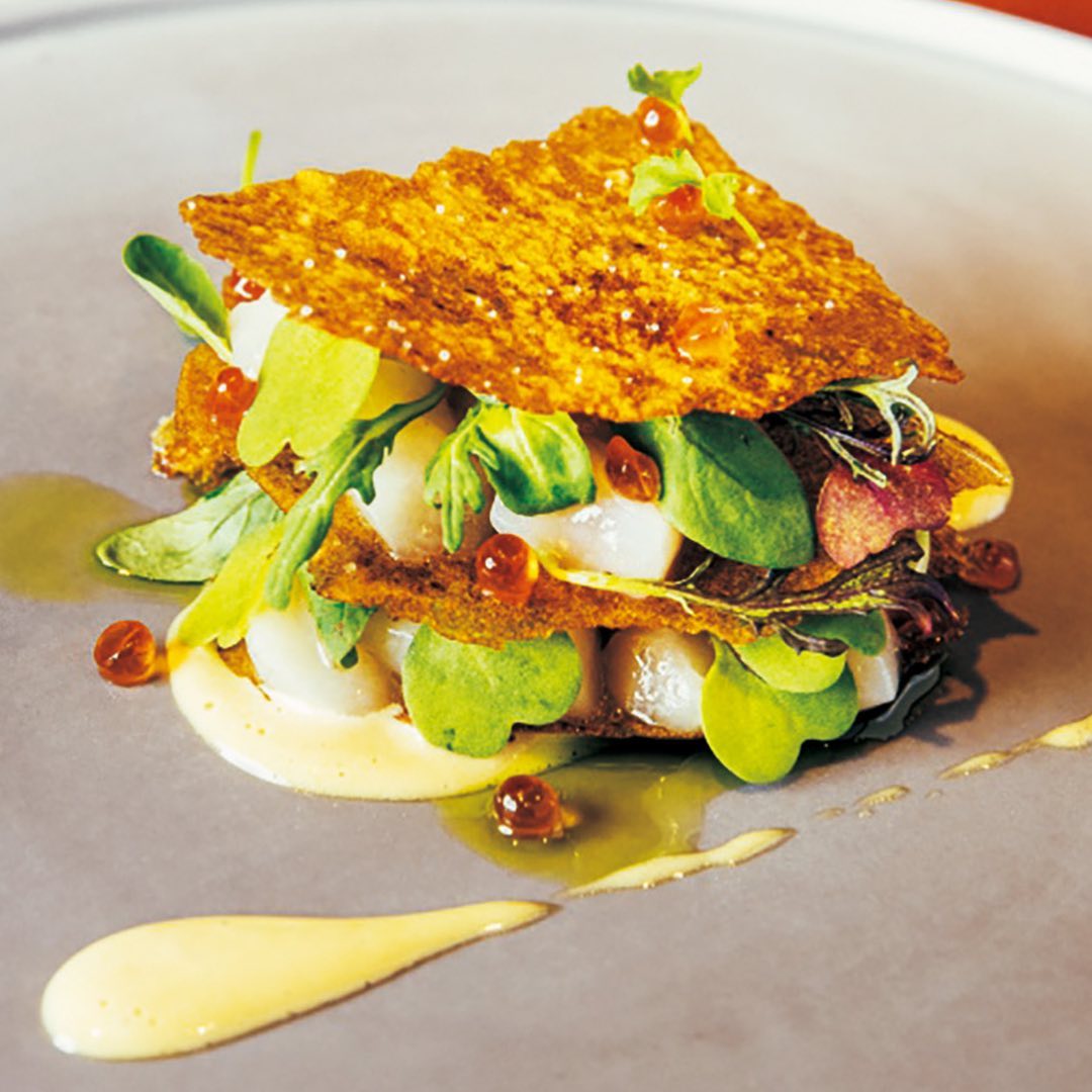 写真①▷昆布、ソアヴェ、発酵ハニーライムでマリネしたホタテは、お粥を揚げた米のクロカンテでミルフィーユ状に。