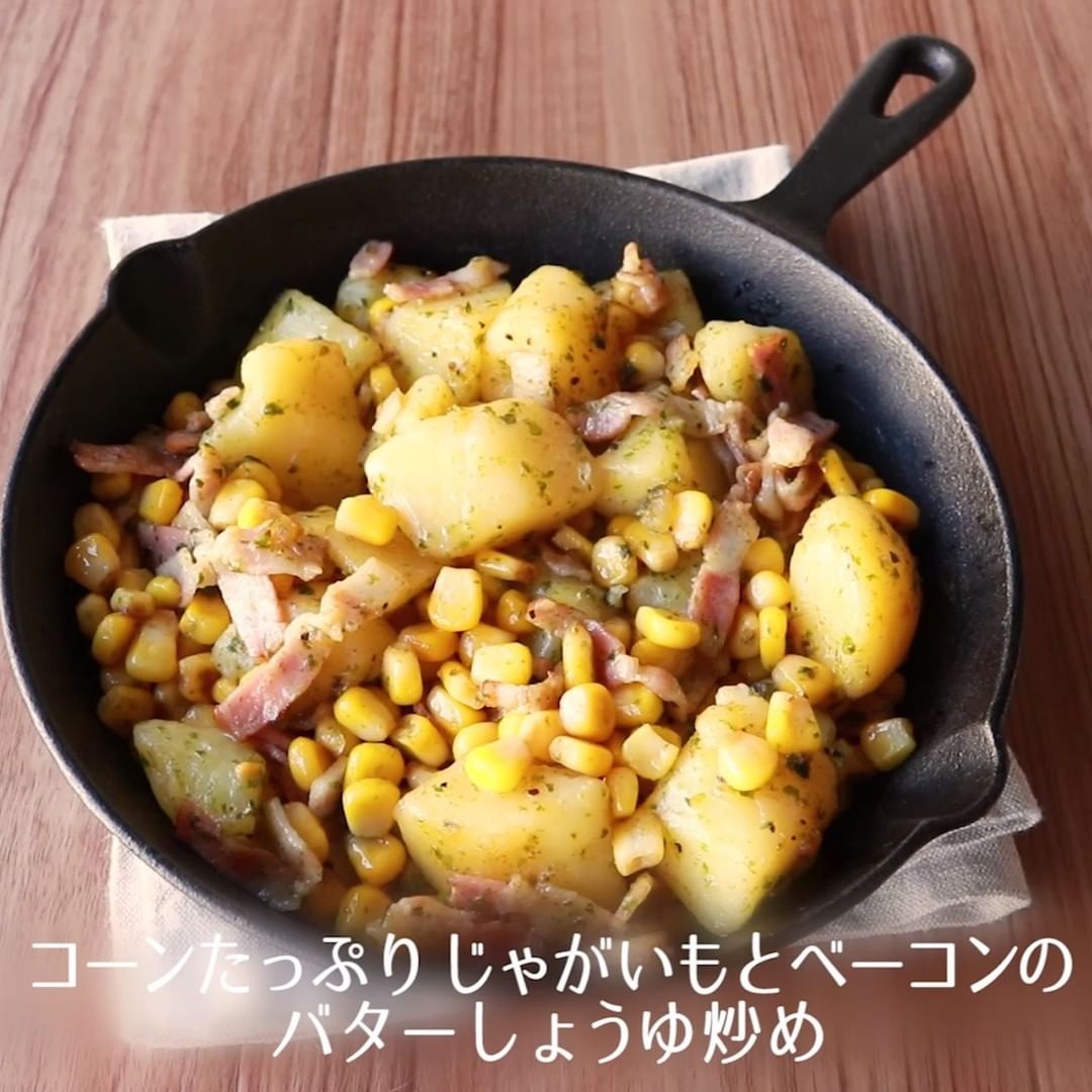 大人から子供まで大好きな、コーンたっぷりのじゃがいもとベーコンのバターしょうゆ炒めはいかがでしょうか。