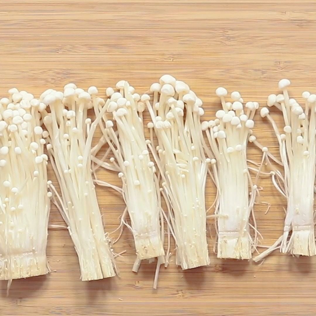 1. えのきの石づきを切り落とし、6等分にします。