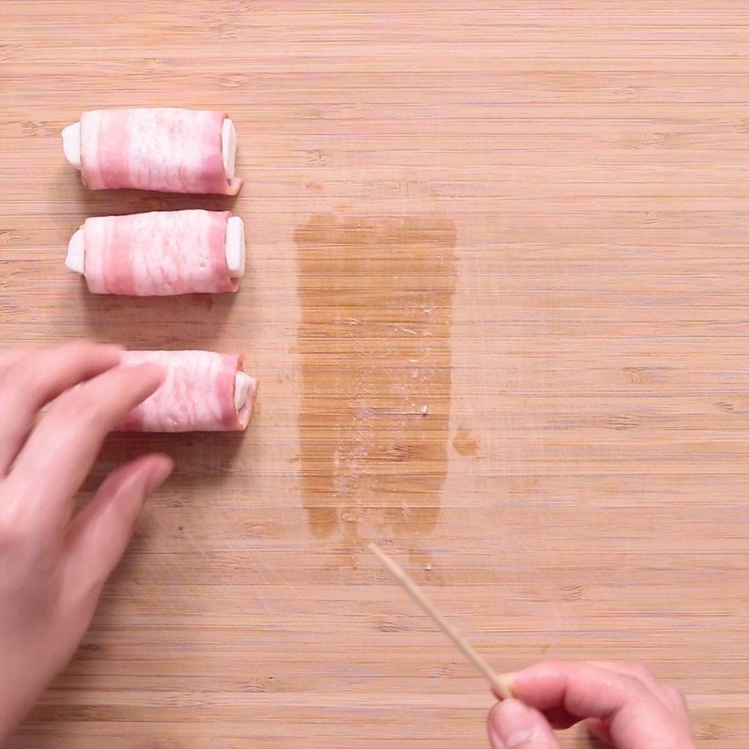 2. ベーコンで1を巻き、巻き終わりをつまようじで留めます。