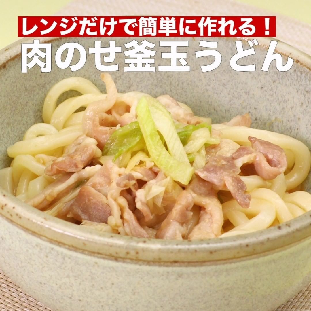 ③<レンジだけで簡単に作れる!肉のせ釜玉うどん>