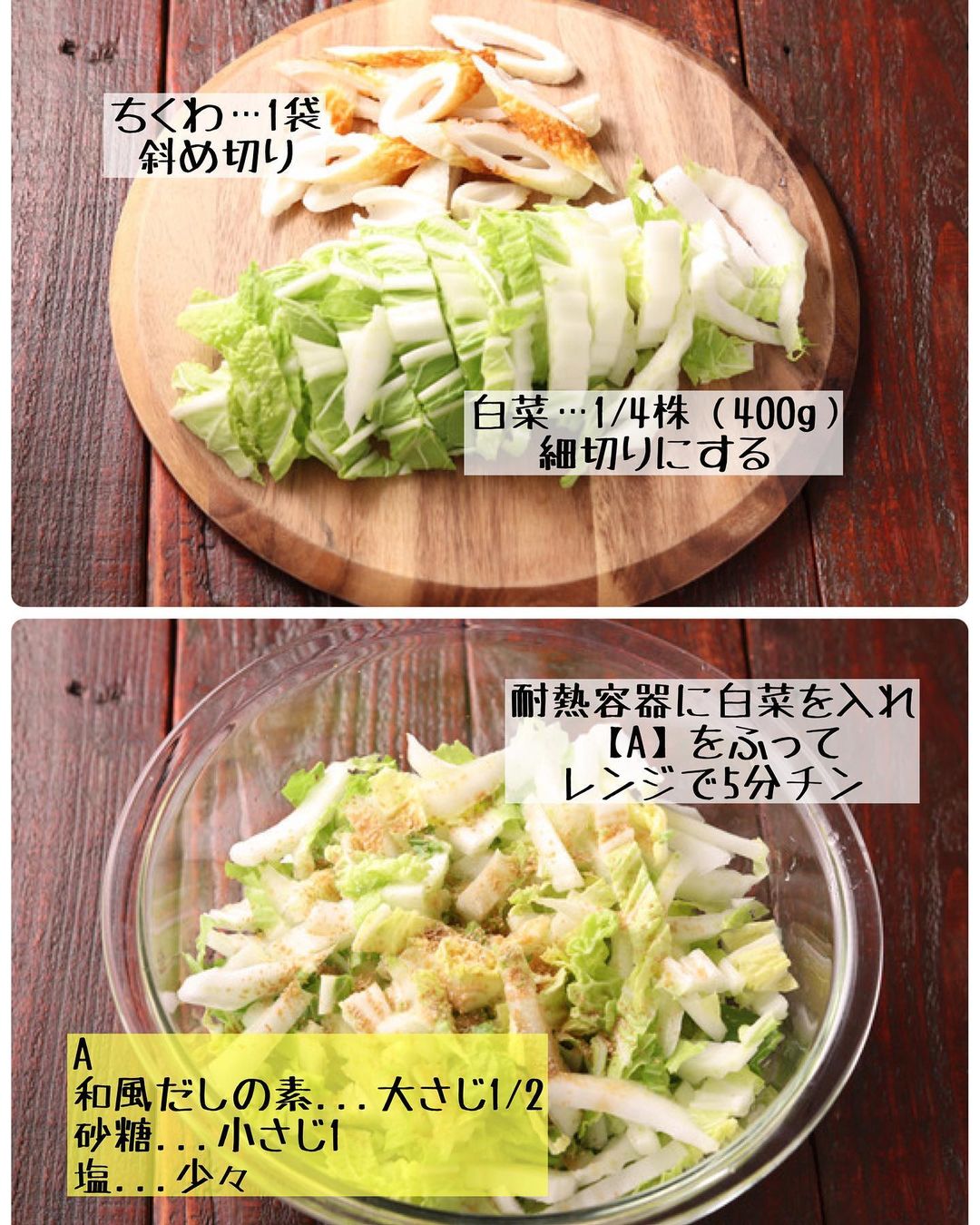 ➋耐熱容器に白菜を入れて【A】をふり、電子レンジ600wで5分ほど加熱する。取り出して粗熱を取る。