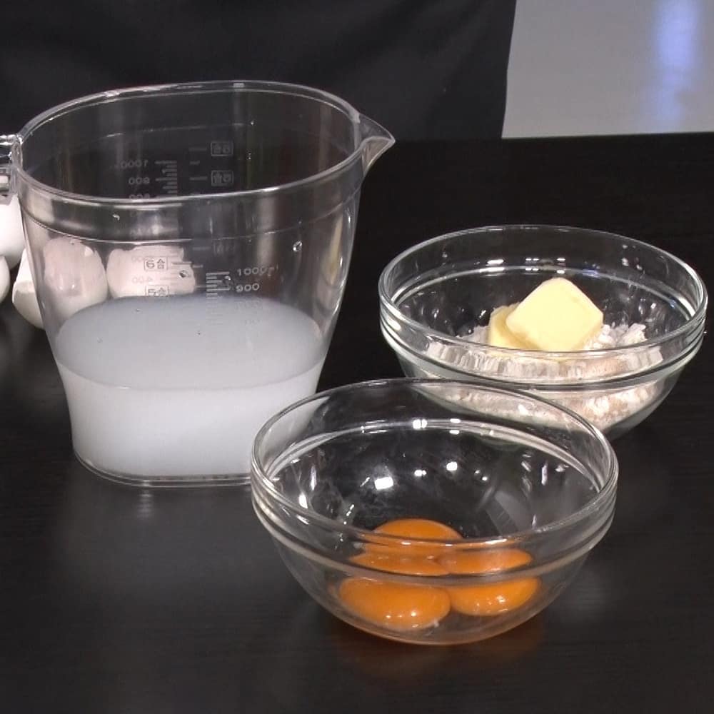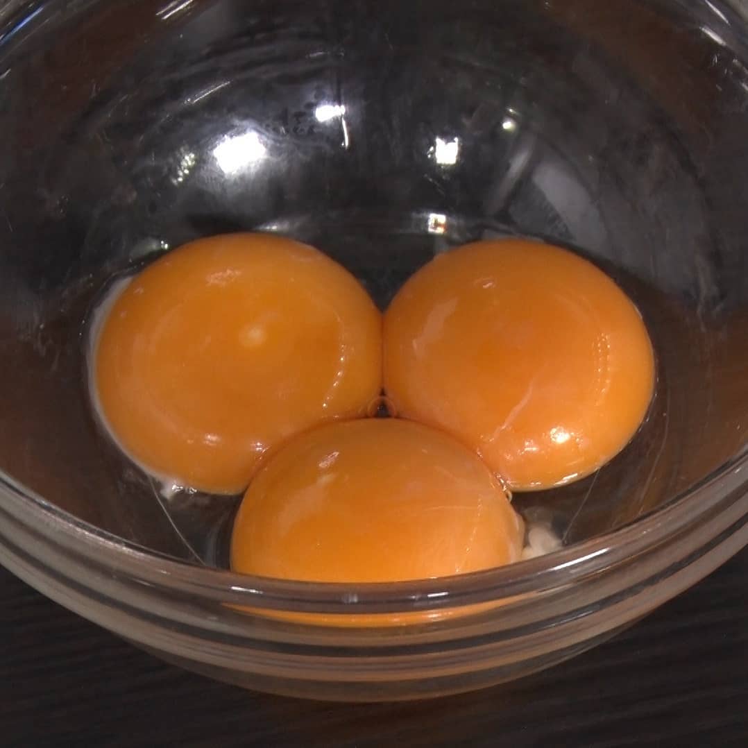 ①卵黄だけの卵(3個)を割ってボウルに出す