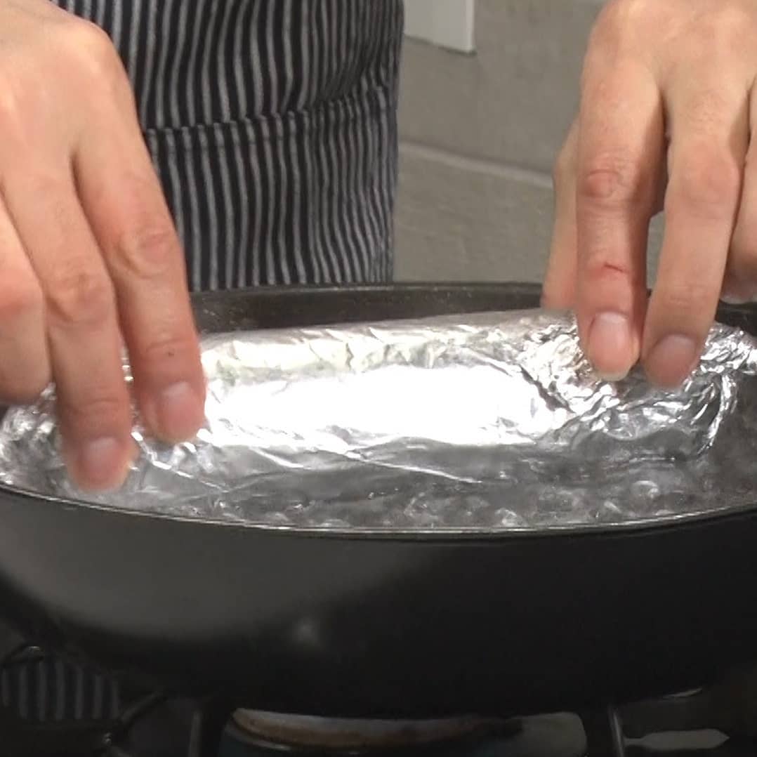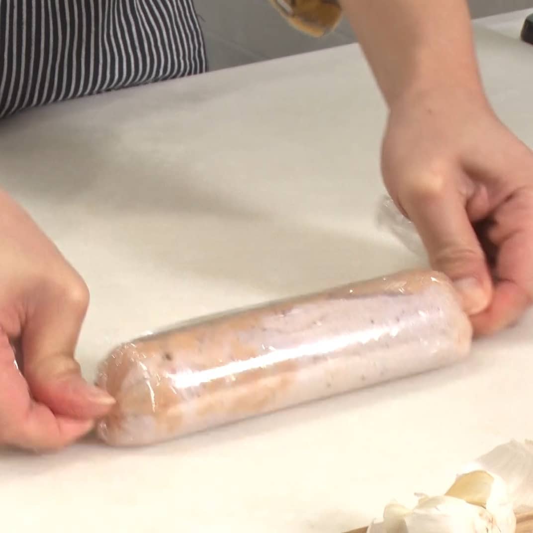 ⑨巻き終わったらラップの両端を持ち、奥から手前に転がしながら空気を抜き、さらにラップの上から同様にアルミホイルを巻いていく