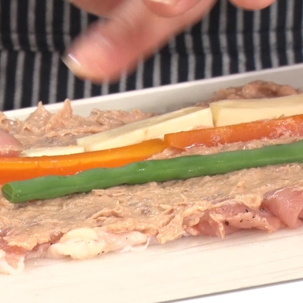 *一度巻いた時、鶏肉に隙間がある場合はペーストを塗って埋めてください