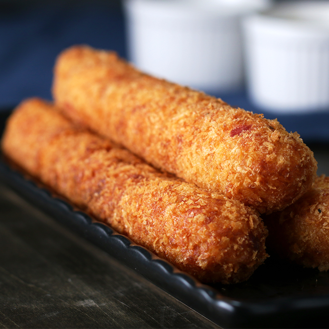 5.(4)のラップを外し、溶き卵にくぐらせ、パン粉をまぶして、170℃の揚げ油できつね色になるまで3分ほど揚げたら、完成!