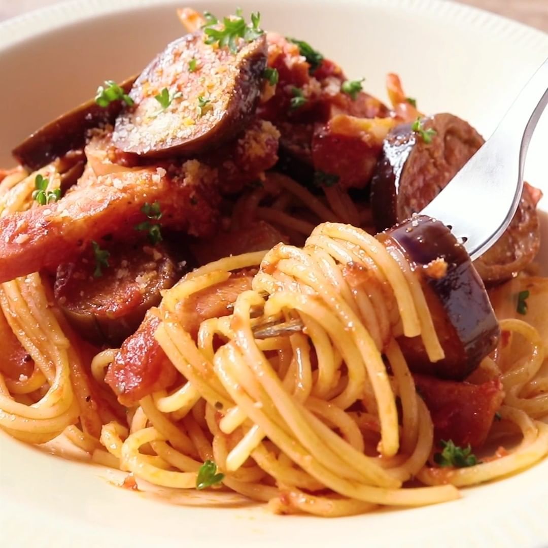 ②ナスとベーコンのトマトソースパスタ