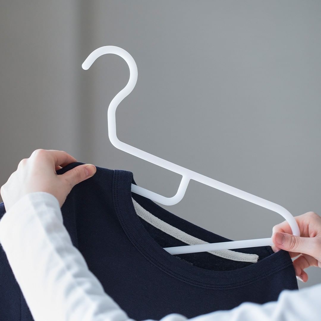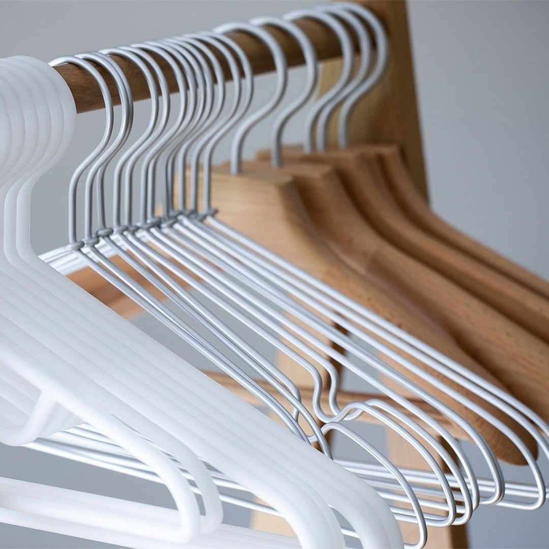 かさばらず、衣服の肩が出っ張らないようにつくられた、アルミハンガー。軽くて扱いやすく、首回りの伸びやたるみを防ぐ形状の、ポリプロピレンハンガー。天然木のブナ材を使い、型崩れしないよう厚みをもたせた、木製ハンガー。