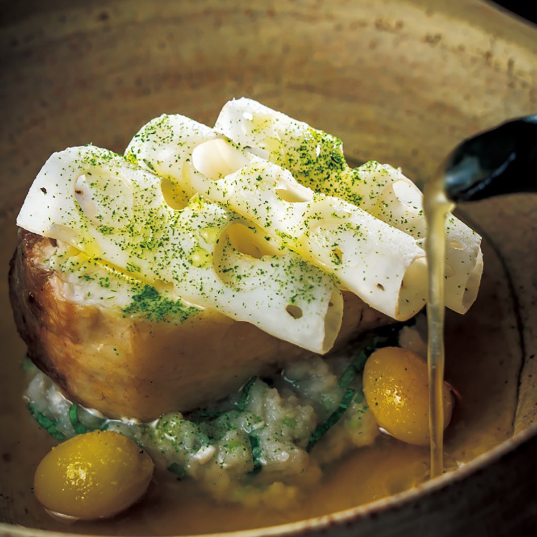 ほろりと身がほぐれる絶妙な焼き加減の鰆の下に、レンコンのピューレを敷き、食べる直前に南部鉄器で牛出汁のコンソメをかけていただく