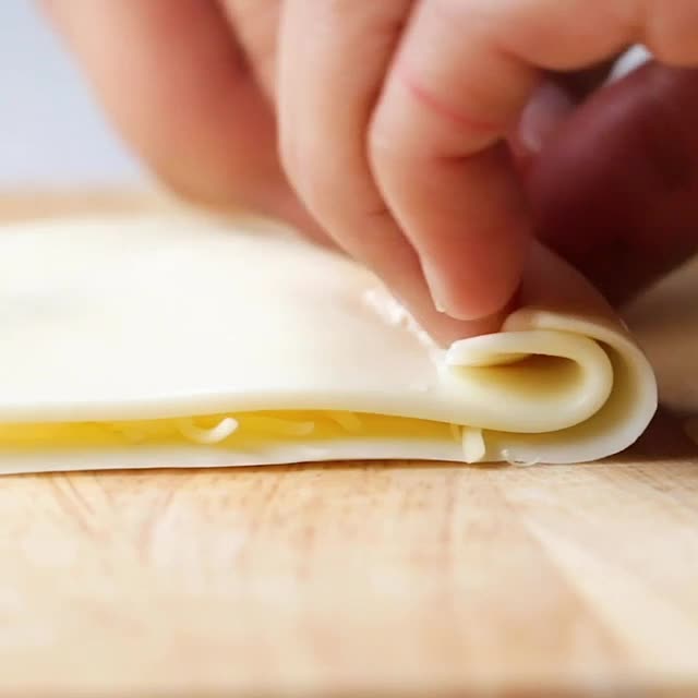 4.スライスチーズの上にシュレッド・モッツァレラチーズを散らし、上からさらにスライスチーズを重ねる。手前から奥にきつめに巻いて半分に切る。