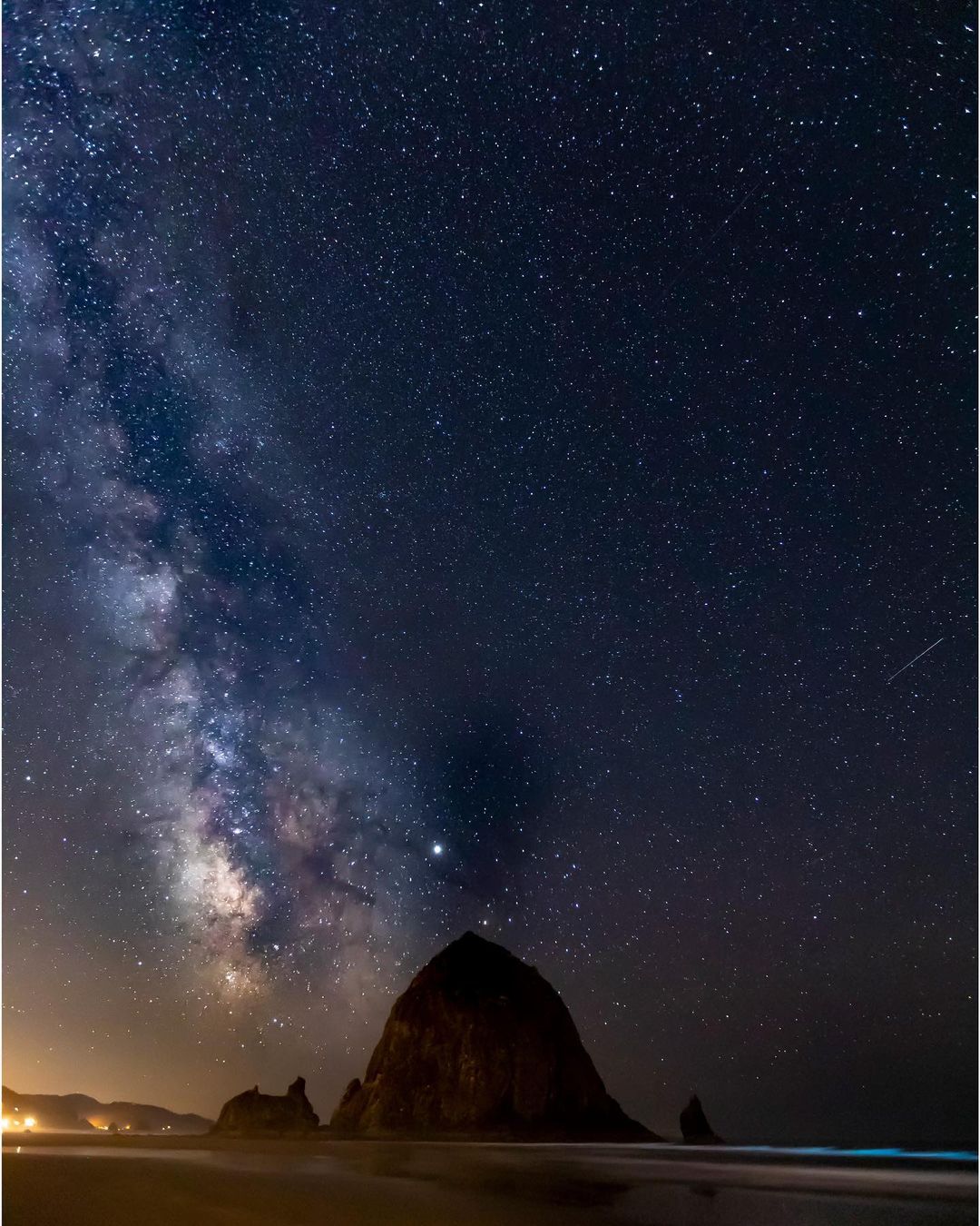 #BehindTheShot with #CanonExplorerOfLight @darrellgulin: “This image was taken in July 2019, when my wife and I took a road trip for a couple of days to Cannon Beach. There was a low tide this evening, allowing me to walk to the water’s edge and thus I was able to place the Milky Way almost over the Haystack Rock. It was really dark and somewhat eerie hearing the surf, but not seeing it.